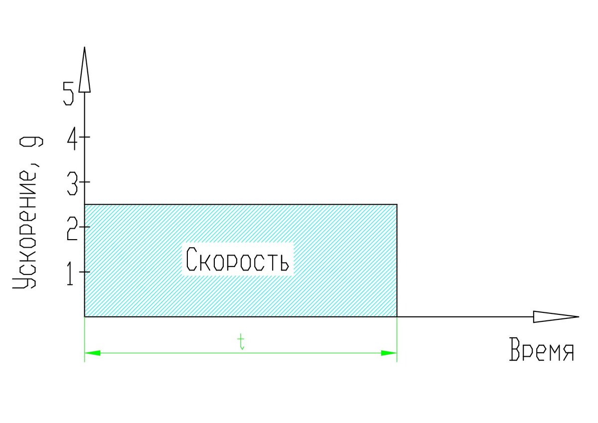 Ускорение иногда соотносят с ускорением свободного падения (силы тяжести) у поверхности земли g=9,81 м/с2, тогда м/с2 взаимно сокращаются и получается безразмерная величина, которую принято измерять в единицах и долях g. Нижеприведенный график показан в таких координатах - по оси иксов время t, величину которого не указываем, по оси игрек ускорение в g.