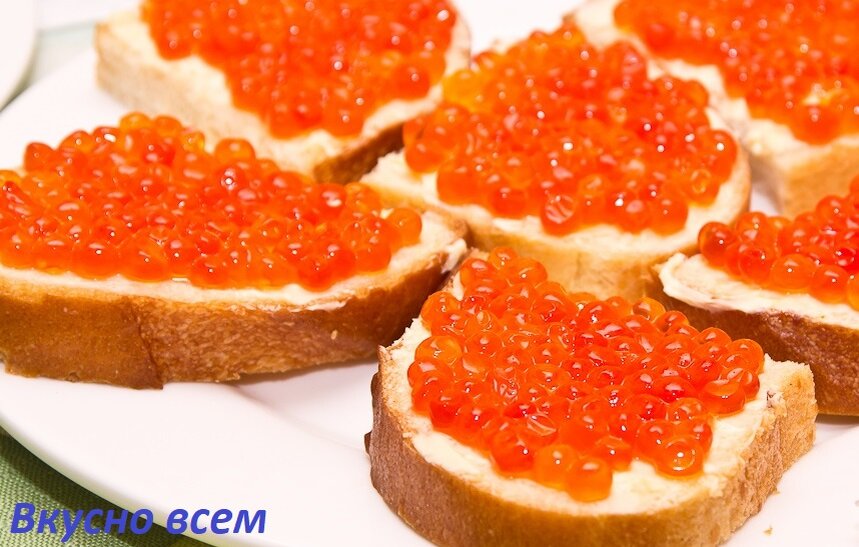 Добро пожаловать на мою кулинарную страничку! Совсем скоро мы будем встречать Новый год и этот всеми любимый праздник не обходится без красной икры! У большинства на столе в новогоднюю ночь всегда присутствуют закуски с красной икрой, хотя бы те же бутерброды. А ведь красную икру можно подать не только на ломтиках хлеба с маслом! Поэтому я хочу вам рассказать, как можно эффектно подать красную икру, чтобы украсить ваш праздничный стол и удивить гостей. А вы знаете, что закуска с красной икрой на столе считается символом благополучия? Кстати, данный продукт ценится не только изумительным вкусом, но и своими полезными свойствами. В ней много белка, который полностью усваивается организмом, что для белков животного происхождения является редкостью. Она содержит много полезных витаминов (А, С, D, фолиевую кислоту), аминокислот и минералов. 1. Бутерброды с красной икрой. Это классический способ подачи икры на праздничный стол. Обычно бутерброд с икрой делается из ломтика батона, который