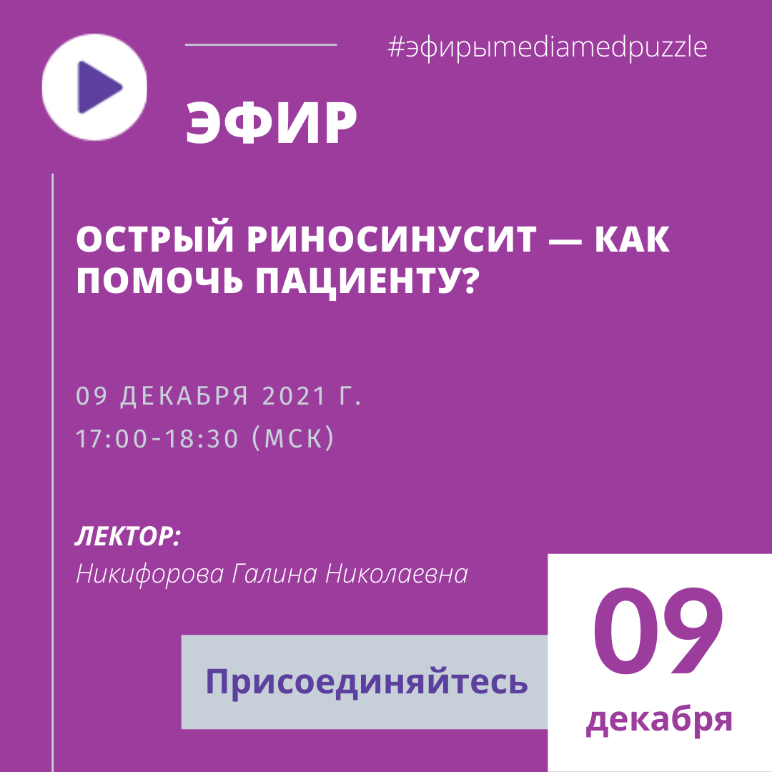 Уважаемые коллеги, приглашаем вас принять участие в вебинаре Острый риносинусит — как помочь пациенту? Дата: 09 декабря 2021 г. Время (мск): 17:00-18:30 Никифорова Галина Николаевна – д.м.н., профессор кафедры болезней уха, горла и носа ФГАОУ ВО «Первый МГМУ им. И.М. Сеченова» Минздрава России, заместитель директора клиники по лечебной работе, оториноларинголог высшей категории, Москва. Ссылка на трансляцию: https://mediamedpuzzle.ru/stream/2441/ #эфирыmediamedpuzzle #медицина #ЛОР #оториноларингология #педиатрия #терапия #синусит #риносинусит #ОРВИ #ОРЗ