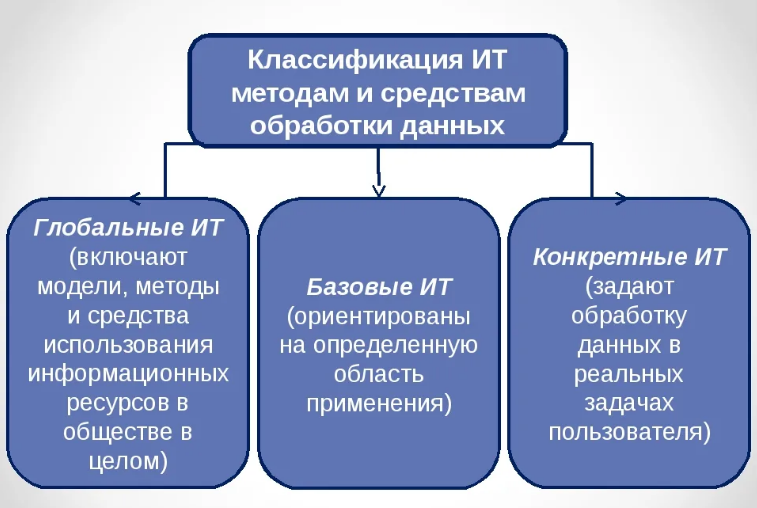 Система методов и производственных процессов определяет приемы, принципы и мероприятия, регламентирующие проектирование и использование программно-технических средств для обработки данных. В зависимости от конкретных прикладных задач, требующих решения, применяют различные методы обработки данных и технические средства. Выделяют три класса информационных технологий, позволяющих работать с различного рода предметными областями: глобальные, базовые, конкретные.