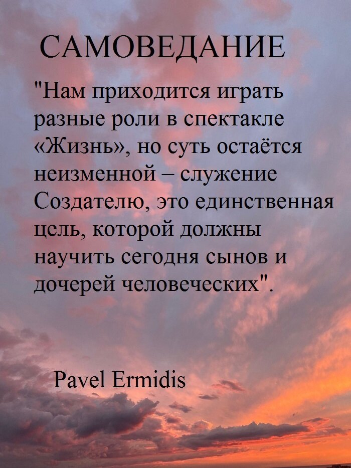 Нам приходится играть разные роли в спектакле «Жизнь», но суть остаётся неизменной – служение Создателю, это единственная цель, которой должны научить сегодня сынов и дочерей человеческих. По определённым обстоятельствам на Земле сейчас никто не рождается с абсолютно чистым божественным Сознанием, и все учителя и правители приходят в этот мир с закрытым доступом к Сверхсознанию. Все, в той или иной мере, подвержены находиться в неведении то или иное время, испытания необходимы, чтобы затем пройти через закон создания Вселенной, который никто не может нарушить. Для того чтобы получить возможностьисполнять свою роль в театре под названием «Мироздание», необходимо пройти обучение и выучить свою роль, набив при этом немало шишек и синяков. Многие учителя давно здесь, некоторые никогда не уходили, не оставляли без внимания, оказывая помощь в нужный момент. Многие только готовятся, не имея ни малейшего представления о том, что способны к передаче знаний, живут обычной жизнью, но получают вну