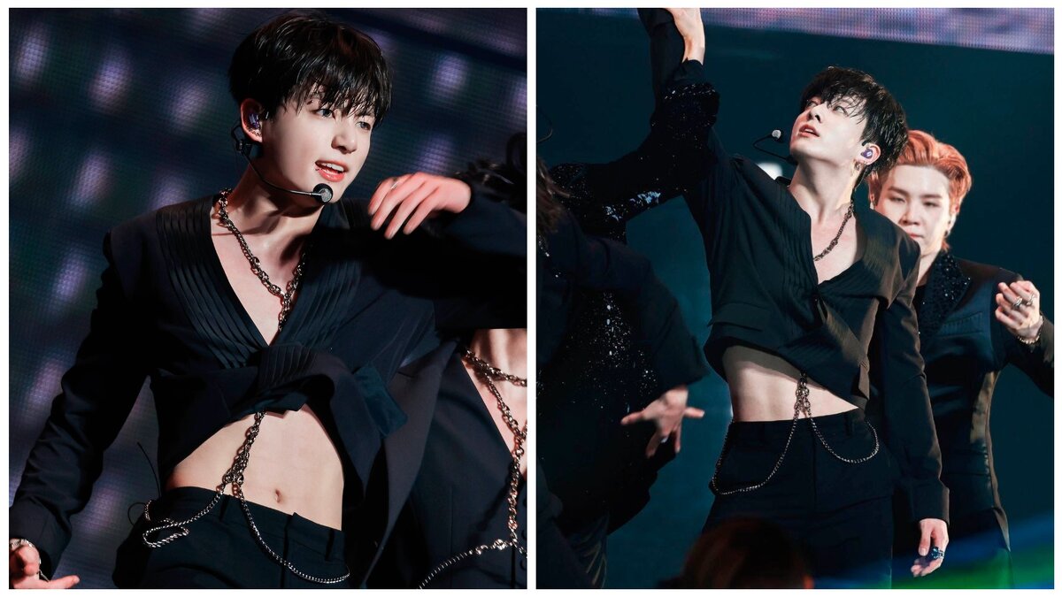 Группа BTS только что успешно завершила тур "Permission To Dance on Stage" с концертами в Лос-Анджелесе. Они выступали перед публикой, собравшей 70 тыс. мест. Чонгук удивил поклонников своим подтянутым телом, так как был одет в слегка обрезанную рубашку. Мало того, что рубашка была глубоко обрезана, он также получил цепь для тела. В паре с пирсингом бровей и губ он выглядел как главный герой фильма "Плохой мальчик". Стилист сделал ещё один шаг вперёд, добавив украшения на запястья и руки, что только придало ему ещё более горячий вид! Можем ли мы быть той бутылкой с водой? Украшения на руках ещё больше подчёркивали его татуировки, а хореография дразнила поклонников, приподнимая рубашку. Настоящий шедевр. Он даже снял рубашку, проходя за кулисы.