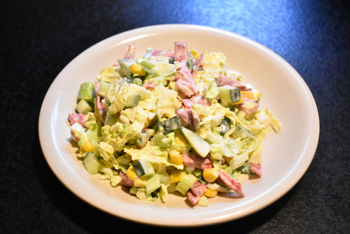 Мой муж без ума от салатов с добавлением пекинской капусты, сейчас он даже в салат с крабовых палочек просит ее добавлять(хотя я привыкла готовить его без). Сегодня хочу поделиться с Вами рецептом вкусного салата, точное название его не припомню. Но с уверенностью скажу, что этот салатик ну просто пальчики оближешь. К тому же все ингредиенты для его приготовления доступны. Так что ноги в руки и вперед готовить его вместе со мной! 👨🍳 Давайте уже готовить! Список продуктов я оставлю в конце статьи, для Вашего удобства. Сегодня я буду готовить не сильно большую порцию, только для нас с мужем на пару раз поесть. Половину небольшой пекинской капусты мелко нарезаем. Все м 3 штуки зеленого лука нарезаем и отправляем к капусте. Пробовала готовить этот салат с репчатым луком, но мне не понравилось, с зеленым лучше. Половину большого салатного огурца нарезаем мелким кубиком. 200 г колбасы салями нарезаем соломкой. 3 отварных яйца нарезаем кубиками. С кукурузы предварительно слили всю воду и д
