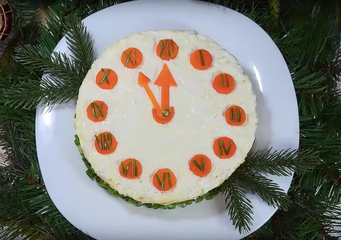 Салат "Новогодние часы" Состав: Картофель, консервы «Печень трески», морковь, яйца куриные, лук, любой мягкий сыр, майонез, соль, петрушка (можно заменить любимой зеленью) Подготовка продуктов: 1. Картофель и морковь отварить, очистить от кожуры. 2. Яйца сварить, остудить, очистить. 3. Лук очистить от кожуры. 4. Из консервов вылить масло. 6. Картофель, морковь, сыр, яйца натереть на крупной терке. 8. Лук порезать кубиком. Приготовление: 1. Выложить слой картофеля, покрыть тонким слоем майонеза. 2. Выложить слой трески. 3. Выложить слой лука (количество лука можно выкладывать по вкусу). 4. Выложить слой сыра. 5. Выложить слой моркови. 6. Выложить слой яиц. Примечание: все слои, кроме лука должны полностью покрывать предыдущий слой. 7. Поднять форму. Края салата посыпать мелконарезанным желтком яйца. 8. Из моркови вырезать 12 кружочков и выложить их по кругу салата в виде циферблата. Один кружочек и 2 полосочки (одна больше второй) положить в середину в виде стрелок. 9. На кружочках мор