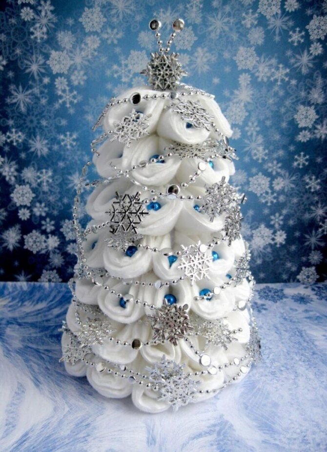 Нарядная ёлка является неизменным символом Нового года. Именно с этим большим, пушистым и ароматным деревом у многих связаны ценнейшие детские воспоминания. Сейчас мы уже взрослые и кто-то даже имеет своих детей, но праздник не перестает быть по-детски волшебным! Отличным материалом для изготовления новогодней елочки будут ватные диски. Имея белый цвет и мягкую фактуру, они прекрасно подходят для изображения заснеженных пушистых еловых веток. Какие нам понадобятся материалы: Последовательность: Берем картон и склеиваем из него конус, который станет основой нашего дерева. Поскольку диски у нас белого цвета, лучше, чтобы и основа была тоже белая. После этого каждый ватный диск сворачивают определенным образом – сначала пополам, а затем еще раз пополам, после чего получившийся сектор круга в нижней части закрепляют степлером. Такие заготовки приклеивают к каркасу по кругу, продвигаясь снизу вверх и заполняя ватными дисками все имеющиеся пустоты. Эту новогоднюю елочку можно украсить различ