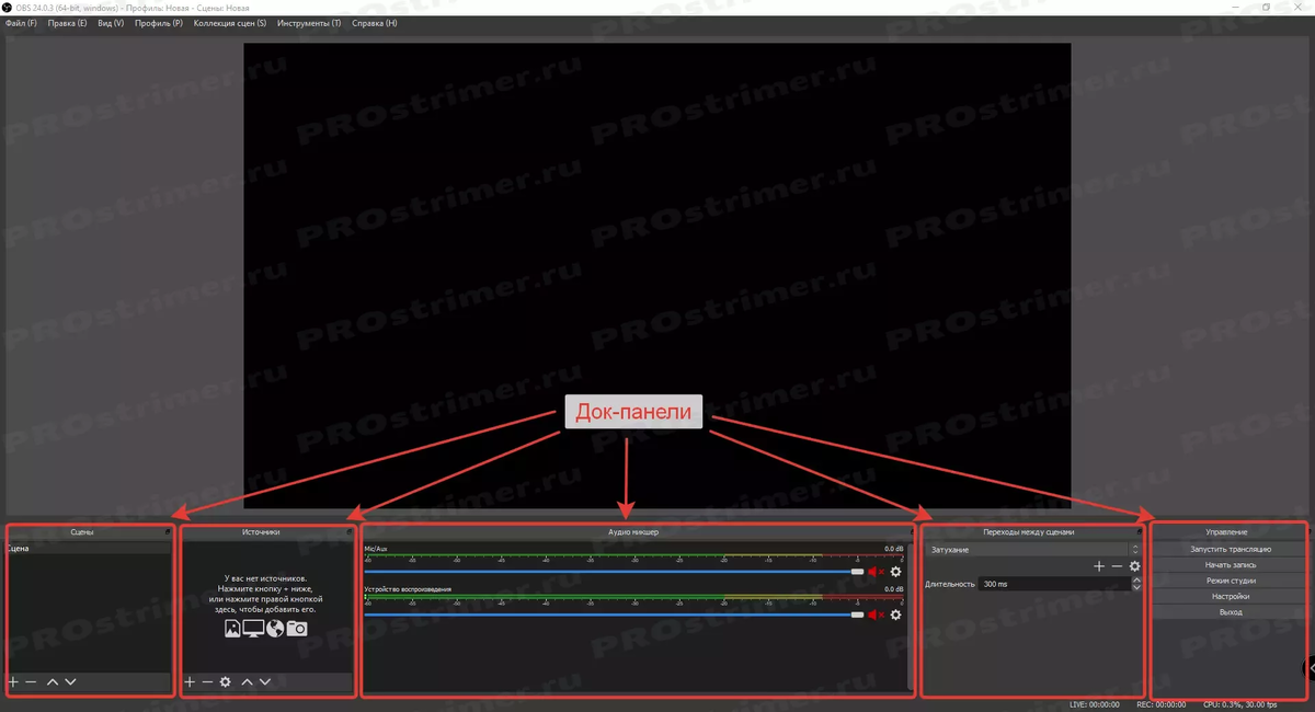 После установки программы и открытия OBS Studio мы видим главное окно программы и пока что непонятные нам док-панели и кнопки. Рассмотрим все кнопки и док-панели по порядку. Док-панели «Сцены» и «Источники» нам понадобятся для дальнейшей настройки записи экрана. Док-панель «Аудио микшер» - здесь настраивается уровень громкости микрофона и звуков системы, для этого используются специальные ползунки рядом с каждым источником.