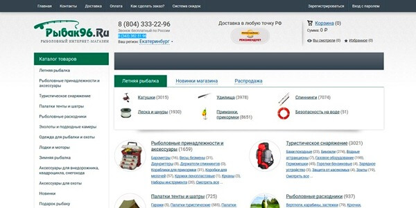 Интернет магазин с прекрасно структурированным сайтом. В каталог вынесены основные группы товаров: зимняя и летняя рыбалка, сапо