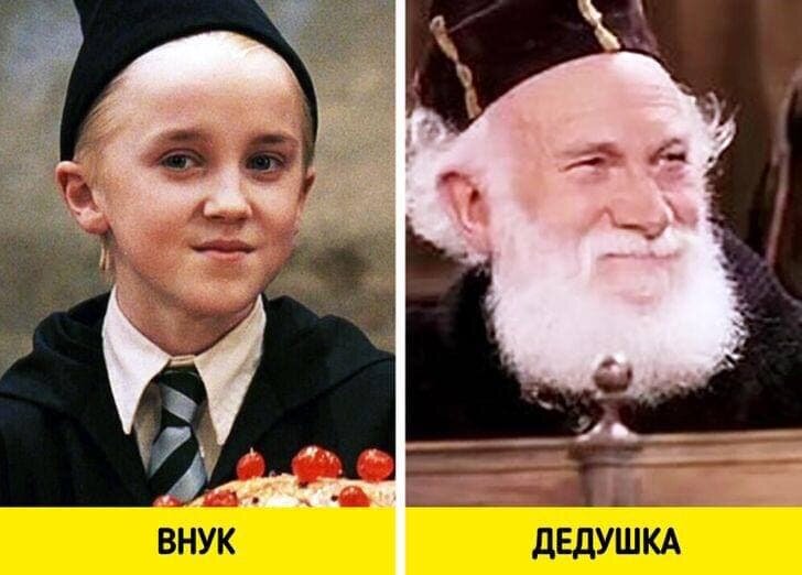 Часто на одной и той же сьемочной площадке оказываются близкие родственники, так как мри кино довольно тесен, но мы об этом не знаем. Я вам хочу сказать больше, что многие актеры и актрисы идут по стопам своих родственников, так сказать- актерская династия. Многие источники пишут, что актерский талант обусловлен генетически и передается из поколения в поколение. При просмотре некоторых фильмов и сериалов, я обратила внимание на субтитры и заметила одинаковые фамилии. Меня очень заинтересовал этот факт и я решила выяснить, являются ли эти люди просто однофамильцами или все же в одном фильме снимаются родственники. Для того, что бы доказать вам этот факт, я сделала подборку из 4 фильмов в которых снимаются актеры- родственники. И так начнем: 1. "Гарри Поттер и философский камень". В этом фильме снимались Том Фелтон и Найджел Энсти которые приходятся друг другу внуком и дедушкой по материнской линии. В фильме внус со своим дедушкой встречаются в нескольких эпизодах. Кстати в жизни Эсти(д