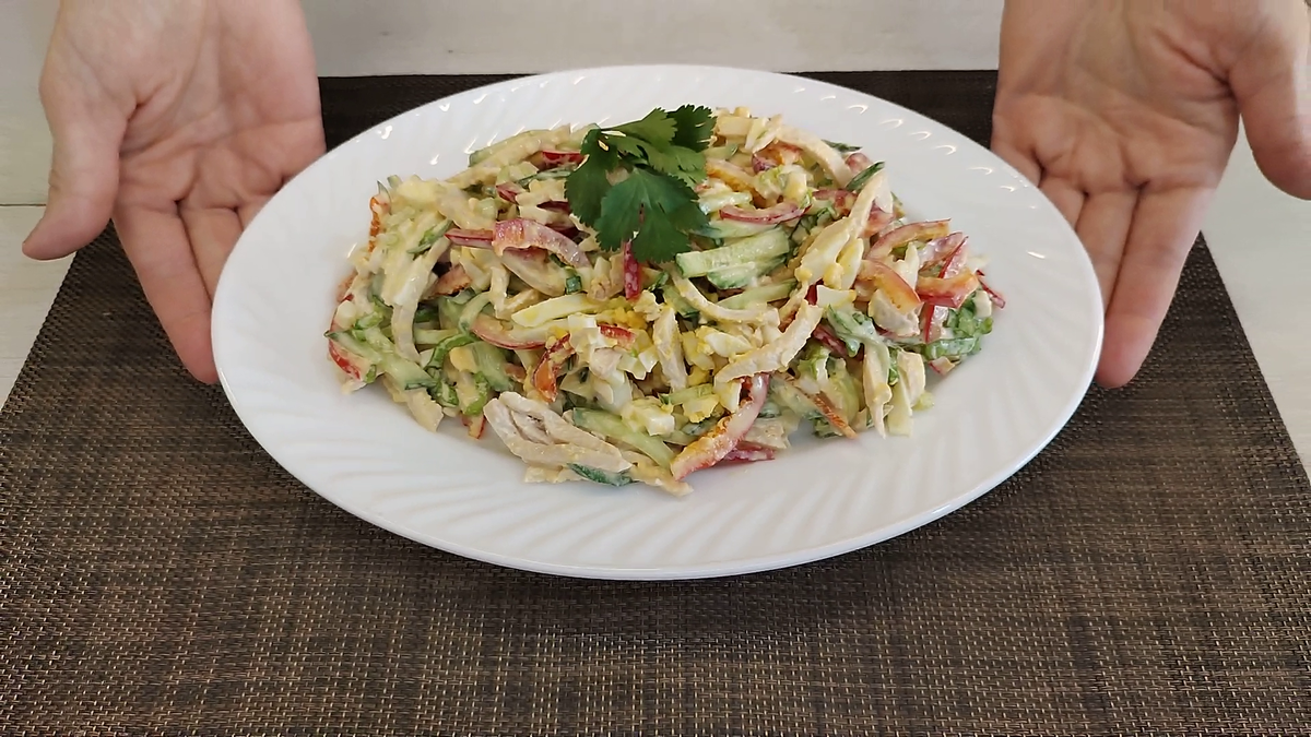 Салат из куриного филе и огурцов, как по мне, является вкуснейшим салатом! Очень простой и легкий салат с куриной грудкой. Готовить такую вкуснятину очень просто. Также салат с курицей смотрится красиво, пёстро. Аромат свежих овощей просто сводит с ума. Так и хочется поскорей его съесть. Список ингредиентов используемых в данном рецепте, я предоставляю в конце статьи. Куриную грудку помойте под проточной водой, обсушите бумажными салфетками. Нарезать куриную грудку. Обжарить на растительном масле с обеих сторон по 10 минут. Огурцы нарезать тонкой соломкой, выложить в глубокую миску. Туда же отправляем нарезанный тонкой соломкой болгарский сладкий красный перец. Яйца варим 15 минут в подсоленной воде. Остывшие яйца очищаем от скорлупы и нарезаем мелко. Остывшее куриное филе нарезаем полосками толщиной 0,5 сантиметра. Мелко нарезаем листья салата, и заправляем майонезом. Посолить (при необходимости), поперчить и тщательно перемешать. Готовый салат с куриной грудкой и овощами украсить зел