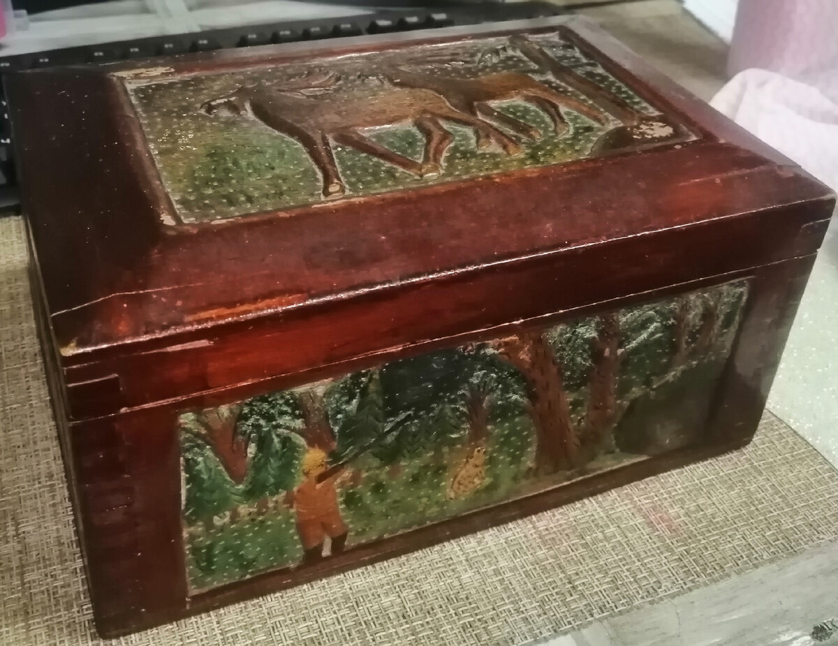 Недавно в мои руки попала старая резная шкатулка. Вот ее общий вид. Очень необычные резные миниатюры с каждой стороны. На верхней крышке изображены то ли лоси, то ли олени. По бокам котята и белочки. Впереди сцена охоты, а сзади медведи. Закрывается шкатулка на потайной замочек, который можно заметить на миниатюре с охотником. К сожалению, были утрачены ножки у данной шкатулки. Предполагаю, что это работа середины 20 века, хотя, я могу и ошибаться. Вот такая удивительная вещь недавно оказалась у меня. Жду ваших комментариев.