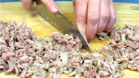 Мясо предварительно отвариваю в подсоленной воде. Остужаю. Нарезаю на небольшие кубики.