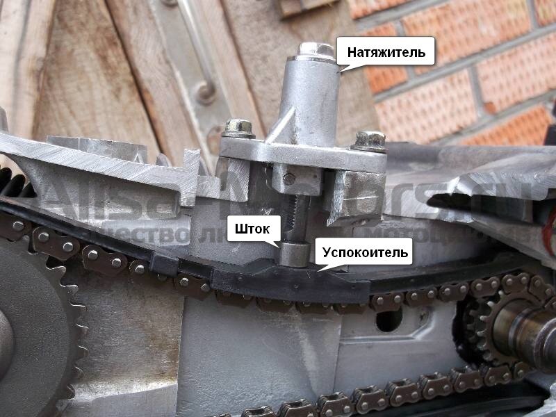 Недавно столкнулся с данной проблемой, цепь была настолько растянута что слетала с распредвала. Выход из данной ситуации оказался очень простым. нам понадобится небольшой кусочек трубы, которая по диаметру будет одеваться на шток натяжителя, отпиливаем кусочек миллиметров на 5 длиннее самого штока и собираем натяжитель с одетой трубкой.