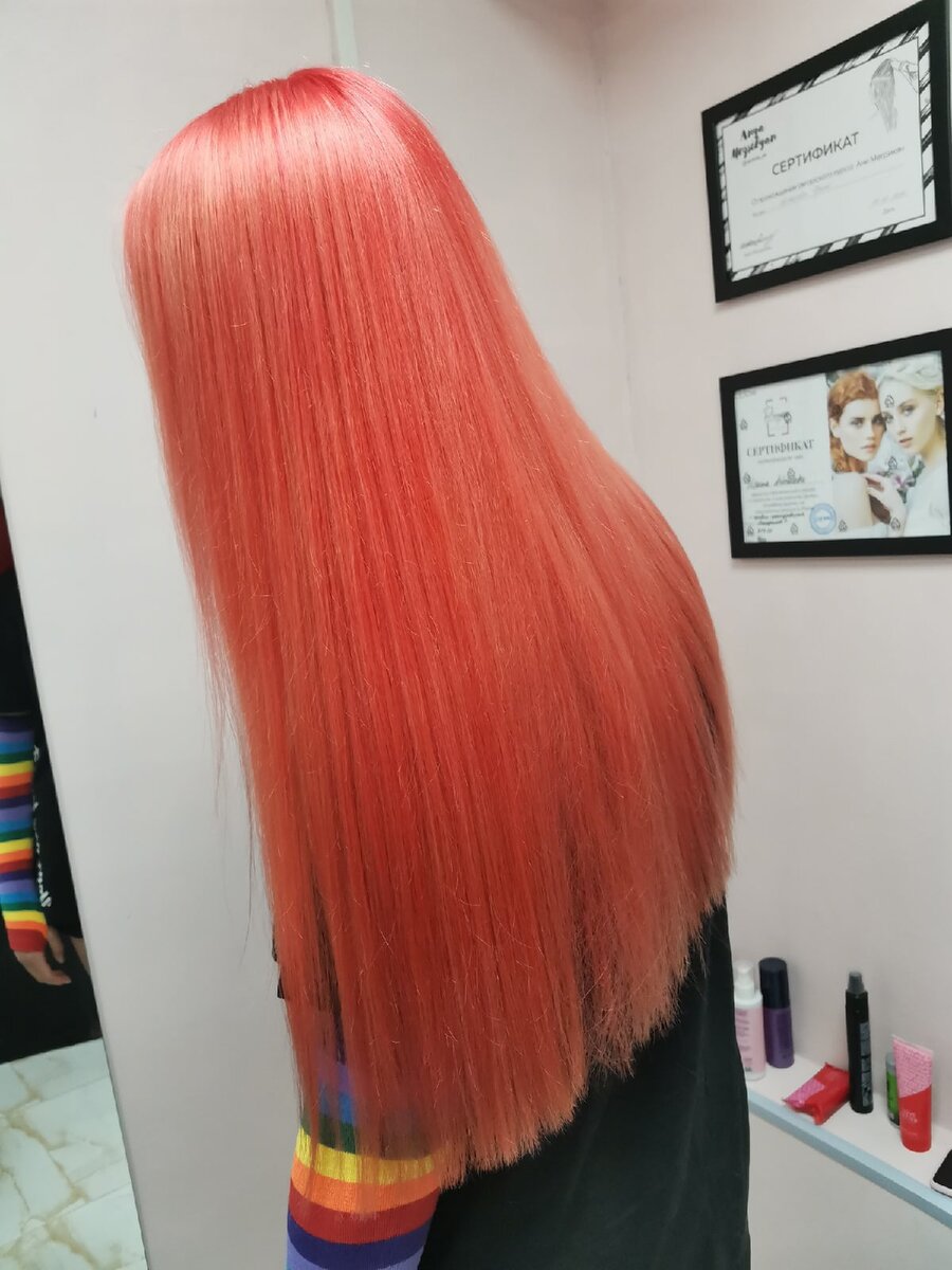 Очень ярко и смело! Моя гостья когда пришла на окрашивание показала мне фото с цветом, который хочет. Я приняла этот цвет за персиковый, может быть вы увидите другой цвет. Ниже следующая фотография это цвет который хотела в итоге иметь моя гостья. Мне она показала именно это фото. Я думаю мне удалось попасть в цвет, моя гостья была в восторге! Я и сама была счастлива и рада, что все получилось. Изначально цвет волос моей гостьи был на 6 угт. В первую очередь для меня всегда является приоритетом качество волос. Но такой цвет не получишь без обесцвечивания, так как нам для такого цвета необходимо чистое рабочее полотно, тоесть чистый фон осветления. Алгоритм действий прописан ниже. Итак: 1. Обесцвечивание. Порошок CD+белок+5.5% оксид. 2. Глубоко восстанавливающий уход+холодный ботокс. 3. Тонирование. Вот здесь самое интересное. Так как именно такого цвета красителя в бренде Picasso нет, мне пришлось создавать этот оттенок. Но когда ты знаешь колористику, это все очень легко. Я взяла кр