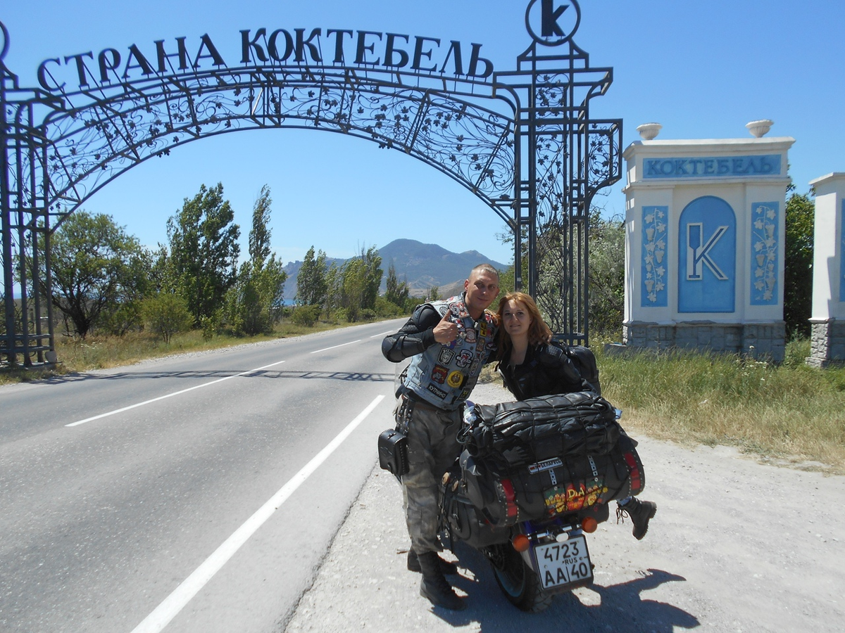 Утром встали пораньше, на удивление быстро подошёл троллейбус и тронулись. Конечно, было предположение, что пляж находится на некотором отдалении от города...Но он находился на таком отдалении, что даже наша сумасшедшая фантазия не могла предугадать. Давно кончилась Керчь, кончились предместья Керчи. Потянулась голая и выжженая степь. Солнце жарило, троллейбус полз, изредка останавливаясь у каких-то кустиков саксаула. Степь раскинулась от края до края. Молчаливая, скупая и величественная. Через пару часов (ну да, как говориться: ни фига, вы пляж отгрохали!) наконец-то прибыли. Пляж оказался приличным и чистым, с белым песочком. А море выдало облом: температура была такая же, как в наших реках в июне. Руки-ноги не сводило, но особого комфорта на было, и половые органы пытались втянуться внутрь. Я-то к такой водичке был привычен, а вот Анна Геннадиевна, при попытках затащить её в воду. как истиная кошка вопила и упиралась всеми своими конечностями, сообщая всему пляжу, что я желаю её погибели. Погибели любой жене я не хотел, поэтому отправил её загорать, а сам немного побарахтался--не зря ж приехали! Потом чего-то я задубел напрочь, и тоже выполз на песочек. К вечеру возвращались тем же троллейбусом, пока пёрлись по жаре через степь--весь эффект от купания сошёл на нет. Были грязные и уставшие. Решено было в ближайшее время свалить из Керчи, и впредь выбирать места не по принципу--где поближе, а всё-таки по отзывам. Ближайший населённый пункт, согласно весёлому навигатору, был Коктебель, про который у нас было столько же познаний, как и о Керчи. Но!!! На въезде в этот городок стояла замечательная арка с надписью "Страна Коктебель". При моей любви к понтам и красивым жестам--это была чуть не главная доминанта. Я поклялся там сфоткаться вместе с мотоциклом, хоть бы его пришлось для этого толкать в горы вручную.