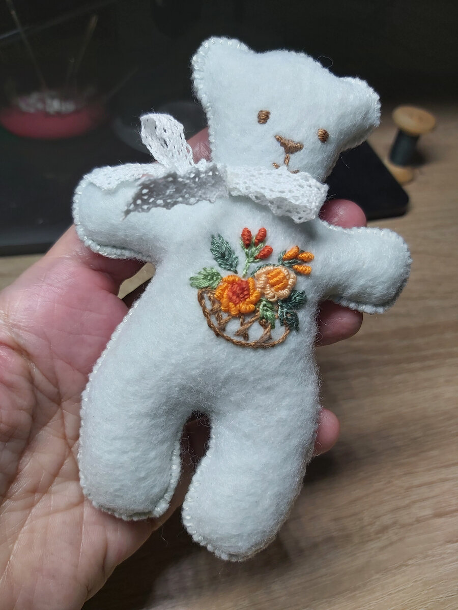 Этого мишку я специально сделала для мастериц, которым хочется сделать простую игрушку за короткое время. Вы можете его сделать с детьми или внуками в новогодние каникулы, они не за горами! Я сделала вышивку с розами, а вы можете вышить что угодно, хотя бы елочку, ведь скоро Новый год! А я сделала сразу двух, подарю их двум маленьким девочкам-сестричкам, мишки почти одинаковые, чтобы девчонки не подрались (шутка)! Для работы вам понадобятся: - кусок мягкого фетра (А5), толщиной 1мм - мулине для вышивки : - три оттенка розового (красного или оранжевого), два оттенка зеленого и коричневого цвета для вышивания узора - мулине для сшивания игрушки - белого цвета Вы смело можете заменить мулине на ирис! - синтепон для набивки - иголка - терморучка - кружево или лента для банта Схема игрушки Описание работы: 1. перенесите рисунок на фетр при помощи терморучки или маркера и вырежьте 2. вышейте мулине в 3 нитки (или ирисом) узор на груди и мордочке Схема вышивки Вышивка крупным планом 3. С