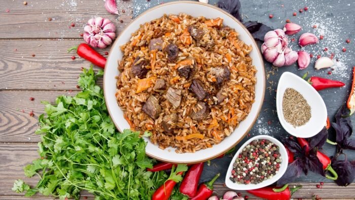 Выкладываем плов горкой на блюдо для подачи, сверху кладем дольки чеснока из него для украшения.