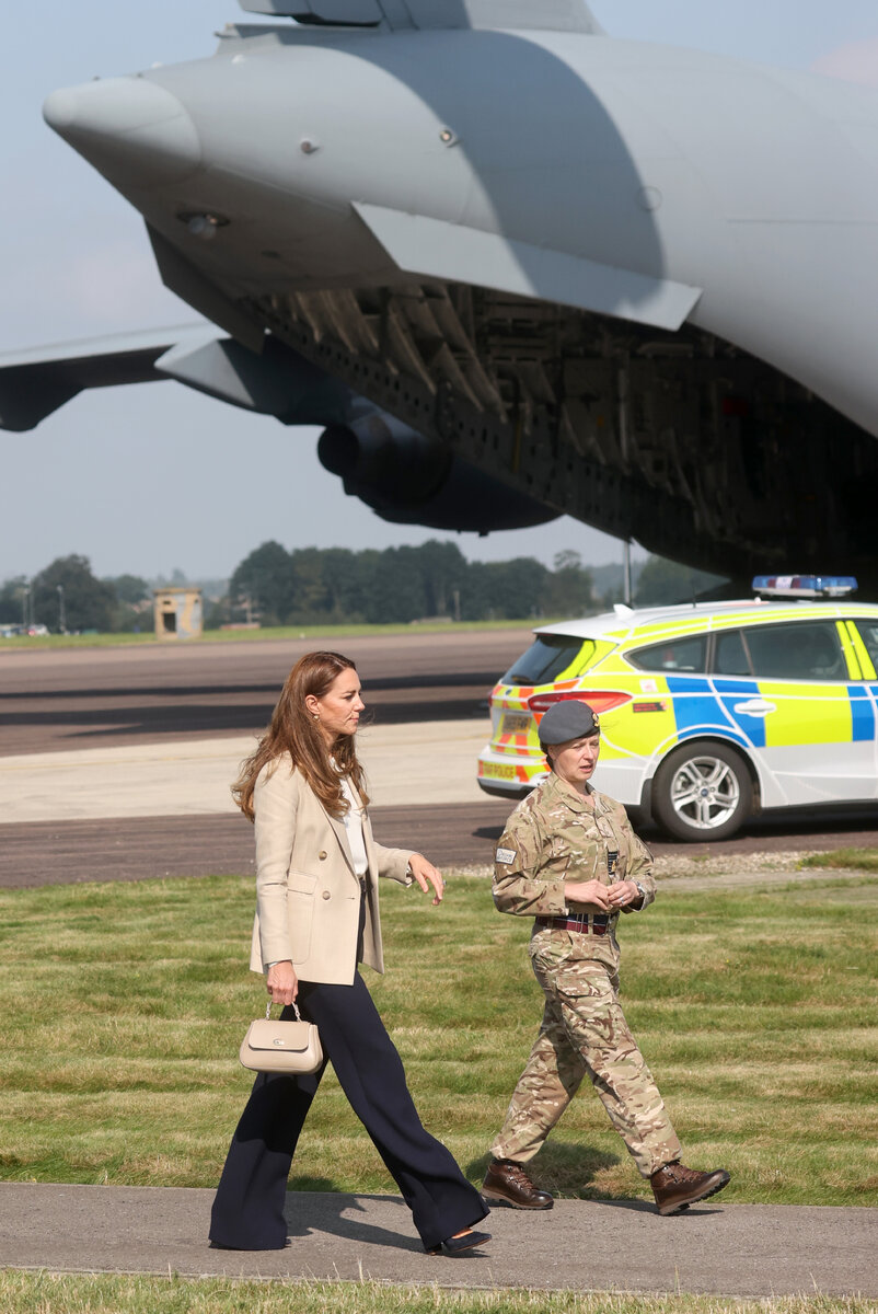 Не первую неделю СМИ пишут о вероятной четвертой беременности герцогини Кембриджской, однако на свежих фото, сделанных сегодня в Оксфордшире, Кейт выглядит так же, как и раньше. Только мы сегодня писали о редком фото Кейт Миддлтон с принцем Джорджем и принцессой Шарлоттой, сделанном на днях в Лондоне, как она сама пару часов назад впервые за два месяца вышла в свет. Для дебютного "выездного" мероприятия после летних каникул Кейт предпочла лично пообщаться с британскими военными, которые недавно приняли непосредственное участие в эвакуации гражданского населения из Афганистана, в частности, из столицы страны – Кабула. На базу ВВС Великобритании Брайз-Нортон, расположенную в Оксфордшире, герцогиня прибыла на военном вертолете. По прилете ее встретили военные и гражданские лица, которые осуществляли спасательную операцию и приютили на базе порядка 800 человек. Для поездки мать троих детей выбрала светло-серый двубортный пиджак Larsson (285 фунтов стерлингов), мини-сумочку бренда Tusting (
