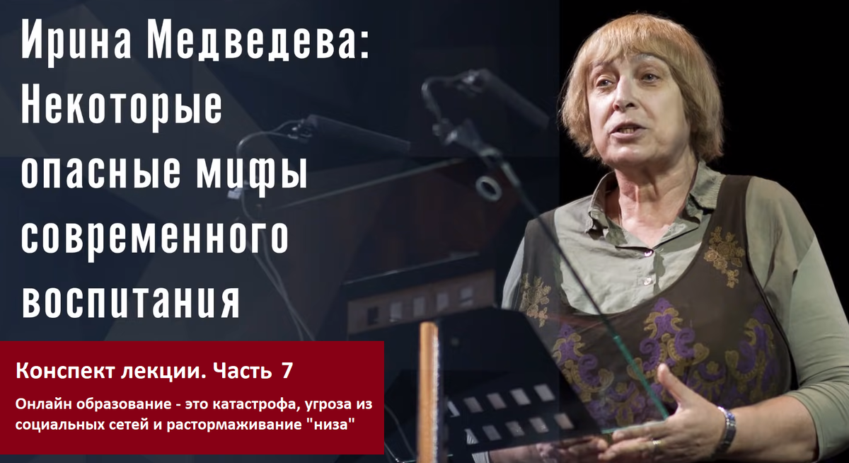 Продолжение конспекта видеолекции детского психолога Ирины Медведевой – о современных опасных мифах в воспитании. 7-я часть. Предыдущие: 1, 2, 3, 4, 5, 6. Или смотрите видео. В этой части (№7): Онлайн образование – это катастрофа и, помимо прочего, угроза обороноспособности «Теперь модно говорить «тренинг общения». Да разве можно школу сравнить даже с сотней тренингов общения? Школа – это уникальная территория! Кроме того, конечно, что это обучение, которое развивает интеллект, дает необходимые знания. Но она и психику тренирует для будущей взрослой жизни. Это необходимо. Поэтому еще так страшно то, что сегодня нам предлагают так называемое онлайн образование. Даже то, что это было в течение месяца – уже катастрофично. А если не дай бог скажут, что надо перевести детей на это образование… Потому что это же очень выгодно - сколько денег сэкономит государство. Нельзя экономить на образовании! Представляете: один учитель на всю страну будет рассказывать по интернету о географии, другой –