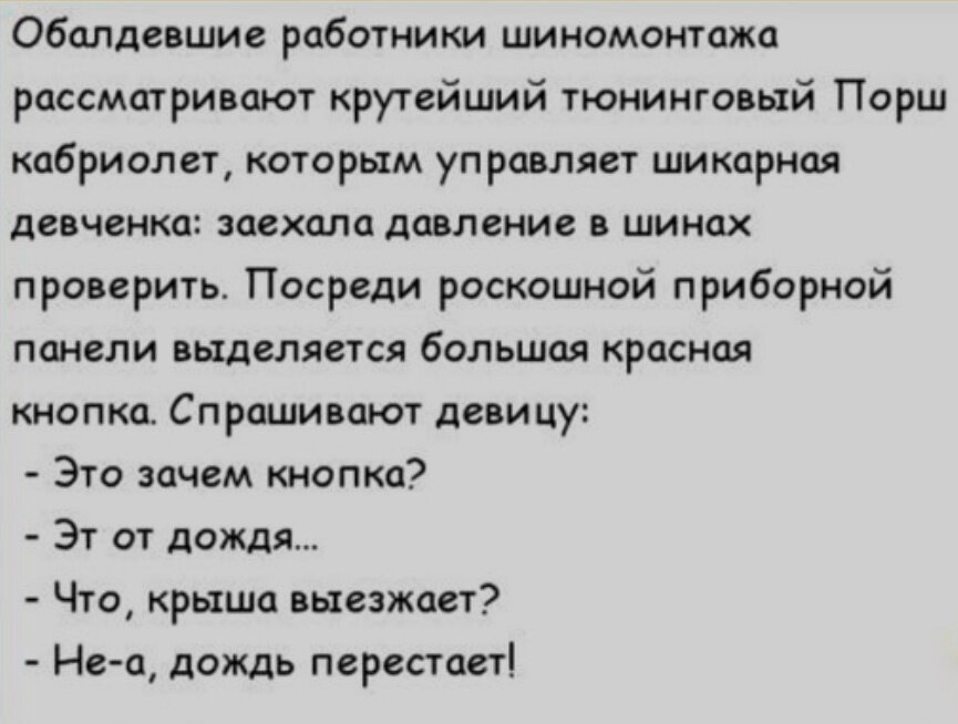 1. Мужик приезжает на курорт, и сразу зарядили дожди. На четвёртый день такой погоды мужик стал собираться домой. Хозяин гостиницы удивился: — В чём дело? — И вы еще спрашиваете? Посмотрите на эту погоду! — Но у вас дома тоже может идти дождь. — Знаете, наш дождь дешевле. 2. 3. Маленький сын вбегает в комнату к маме и горько плачет. Мама: - Сына, почему ты плачешь??? Сын, сквозь слезы: - Мы с папой были на рыбалке, папа поймал большую рыбу, а когда вытягивал удочку, леска оборвалась, и рыба уплыла... Мама, улыбаясь: - Ну, так а что тут плакать, сына?!.. Ты уже взрослый мальчик и должен понимать, что в таких ситуациях надо не плакать, а смеяться! - Так я и засмеялся! #анекдот #подборки #смех #юмор и развлечения #позитив
