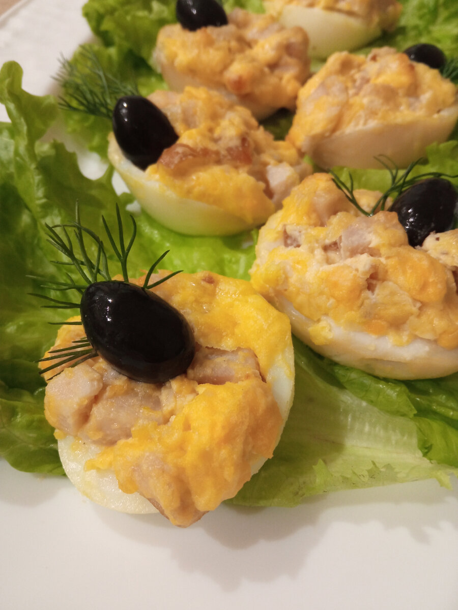 Всем большой привет! Сегодня три закуски быстрые, очень вкусные и простые, улетают со стола в два счета, поэтому делать надо больше. Такие закуски на вашем столе будут востребованы, украсят стол, сытные, интересные, а мужчины их так любят, что уходит одна за одной..Попробуйте приготовить, надеюсь и вы останетесь довольны!Будет приятно, если поставите пальчик вверх и ниже поделитесь своим мнением о рецепте. ЗАКУСКА №1 "ЯЙЦА ФАРШИРОВАННЫЕ МЯСОМ И СЫРОМ" РЕЦЕПТ: Отварные яйца - 3 шт. Копченое мясо (колбаса, окорок, копченые бедра, грудка) - 100 гр. Сыр - 50 гр. Чеснок - 1 зубчик Майонез ПРИГОТОВЛЕНИЕ: Отварные яйца 3 шт. разрезаю пополам Убираю желток и выкладываю в чашу Копченое мясо 100 гр. (можно взять колбасу копченую, грудку, бедра, бекон) нарезаю кубиками Отправляю к желткам Желтки разминаю вилкой Сыр 50 гр. натираю на мелкой терке Натираю зубчик чеснока и добавляю майонез Перемешиваю Готовой начинкой фарширую белки Отправляю в разогретую духовку при 180 градусах на 10 -15 минут