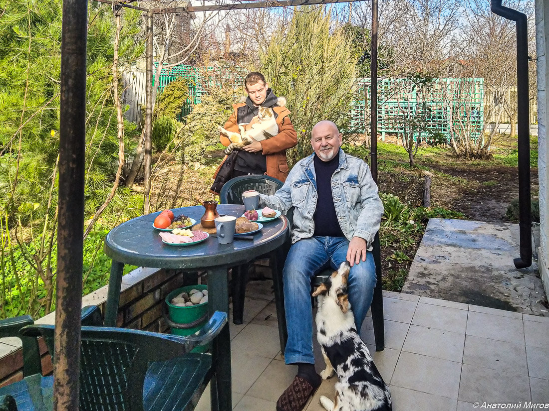 Тепло вернулось, жизнь налаживается. В ночь на 1-е декабря в наш Старый Крым нагрянула зима. Снег, мороз да еще и ураганный ветер. Однако всё это было недолго. Зима нас слегка попугала и ушла восвояси. Снег через сутки растаял. Ну не Сибирь же у нас в самом деле, а тёплый Крым. Дай Бог, теперь к Новому году снова припорошит. Не сказать, что тепло как летом, но завтракать сегодня сели на открытой веранде (на заглавном фото). В воскресенье у нас поздний завтрак. Я с утра иду на рынок, а потом уже мы садимся за стол. Кстати, не только поздний, но и вредный. По будням мы едим по-монашески. Салат из овощей и каша. Либо вместо каши вареные яйца, иногда омлет или глазунья. В общем, как завещал Остап Ибрагимович Берта-Мария Бендер бей, мы не делаем из еды культа. Но в воскресенье другое дело. Тут в ход идут дары природы, в смысле - вкусности с рынка. Горячий хлеб из маленьких местных пекарен, сыр, колбасы, фрукты, виноград. Из своих даров природы у нас остались грецкие орехи - их нам хватит