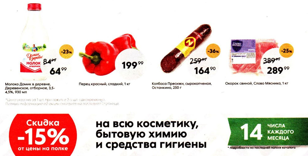 Всем добрый день! Пролистала свежий каталог магазина "Пятерочка", со следующей недели действовать начнет, отметила для себя кое-какие позиции и с вами захотелось поделиться. Давно пора к новогоднему столу закупаться. Начнем с основательных продуктов. Если кто покупает свинину в таких сетевых магазинах - неплохой вариант. Окорок свиной - 290р/кг. И еще мне перец болгарский понравился тут, точнее его цена. И напоминают нам про акцию со скидкой на химию, косметику, средства гигиены. Что хорошо - эта скидка суммируется с акционными ценами. Сыр хочу показать. Вот такой "Президент" делают в нашем городе. Только покупаем мы его не часто, ну как нечасто - никогда. 😁 Говорят, при заводе есть фирменный магазин, надеюсь, доеду до него в этом году). Еще сыры. Их этих в моем списке сыр творожный, делаем с ним бутерброды и тарталетки (решила тарталетки к Новому году испечь сама), и с рыбой и с икрой он сочетается отлично. "Красную цену" не раз брали, особенно если надо куда то в рецепт добавить,