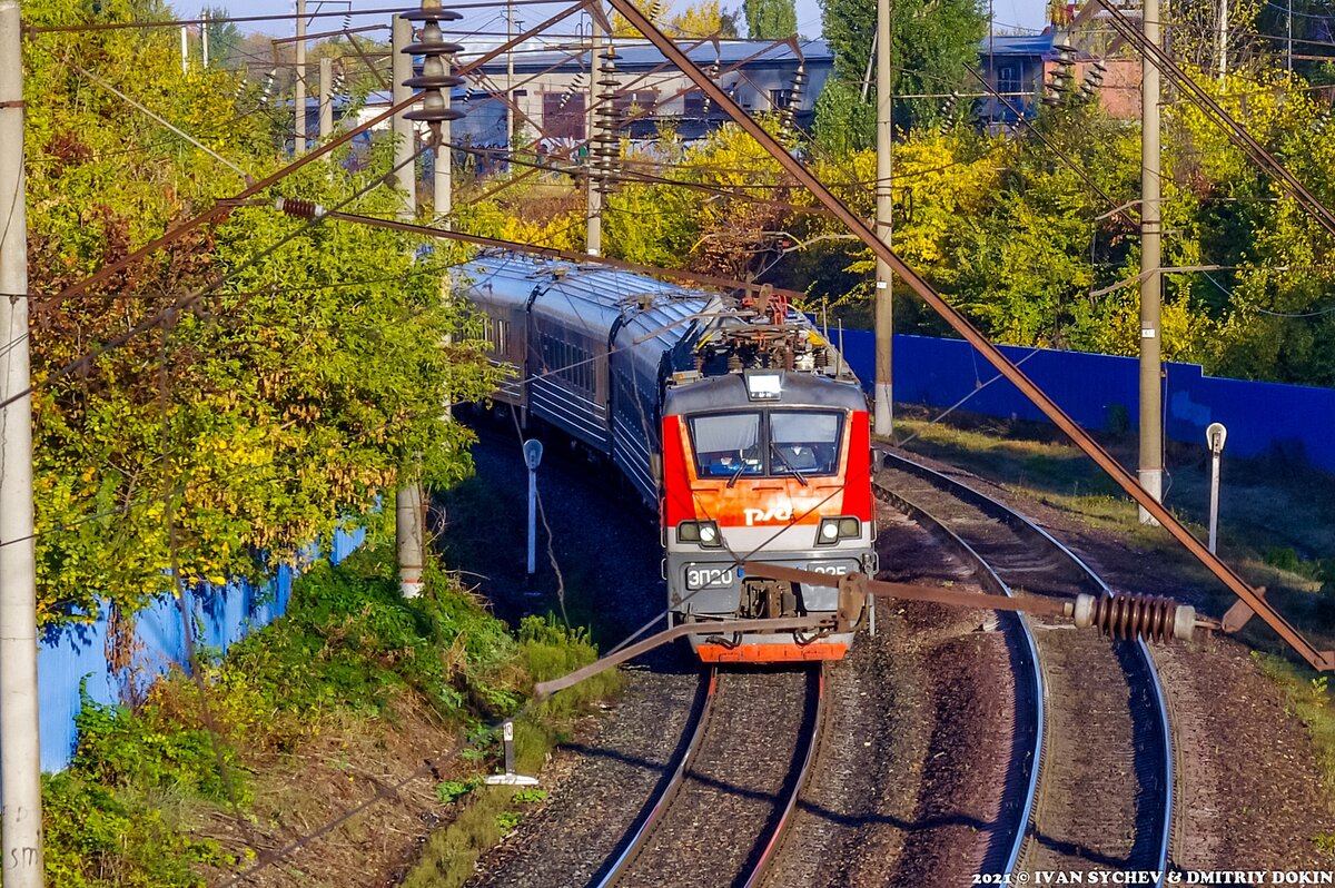 1-2. Яркое, чуть ли не летнее начало ноября месяца. Утро, солнечный свет - что еще надо для хорошего снимка поезда? Да ничего. И вот результат - две фотографии пассажирского поезда с двухсистемным электровозом ЭП20-025.