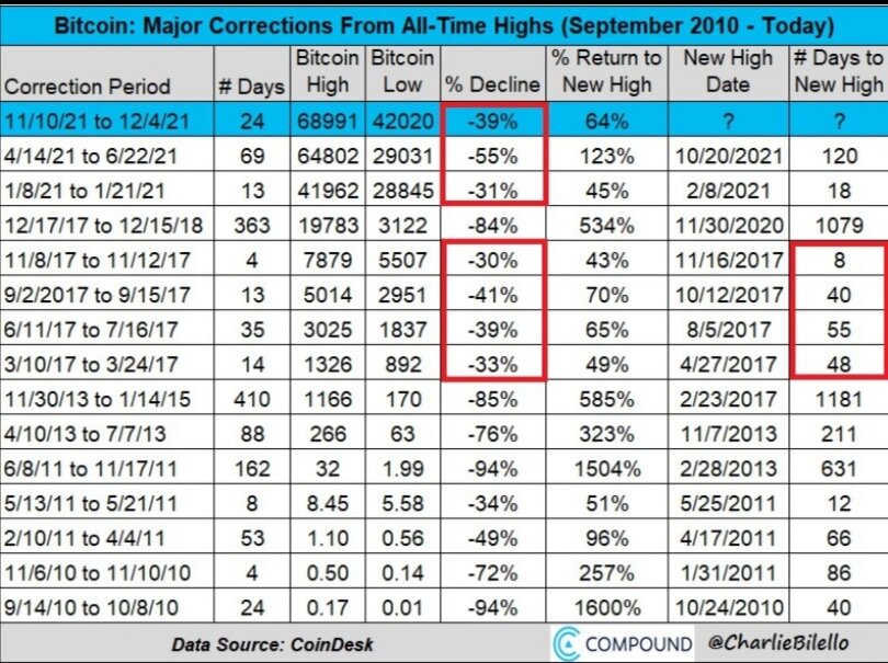 📊 Биткоин: Таблица основных коррекций от ATH c 2010 года