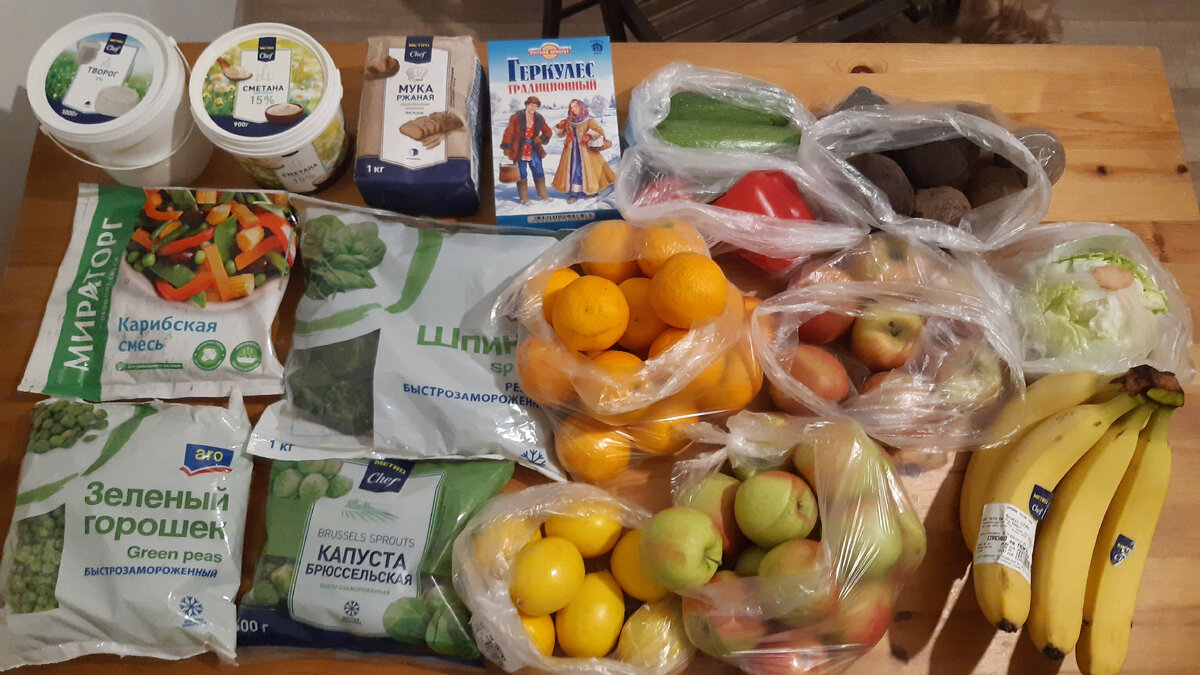 Всем привет, дорогие читатели! Собирались мы сами съездить в Метро, но лениво что-то стало по снегу, льду и холоду, заказали доставку. Кстати, прочитала сегодня о нововведениях у Сбермаркет: 08.12 будут теперь только 3 доставки в месяц бесплатных, остальные - по полной цене. Других доставщиков, видимо, придется искать. И доставка раньше была бесплатной от 1500, а в этот раз - уже от 2000 руб. Такой сюрприз! Вот мой заказ целиком: творог и сметана - большие упаковки по 1 кг ржаная мука и овсяные хлопья долгой варки несколько видов овощей замороженных: зеленый горошек и шпинат по 1 кг и по 400 г брюссельской капусты и карибской смеси свежие овощи - цуккини, болгарский перец, свекла, салат айсберг. Тыкву еще заказывала, но ее не оказалось, не привезли. и фрукты - два сорта яблок, мандарины, лимоны, бананы вот скриншоты заказа с количеством и ценами как видите, заказ на 1968 руб. И еще купила 1 кг хурмы в палатке возле работы - 150 руб. И остаток денег на питание в декабре 11 179 руб #