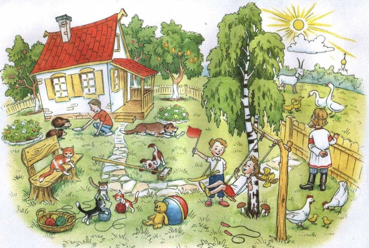Крыша, кошка, ёжик, штакетник, мишка, флажок, груша.