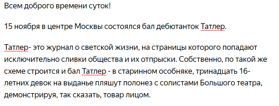 Нужно сказать, что задумка была именно такая - чертова дюжина вальсирует - но то ли Татлеру было отказать неудобно, то ли вся девичья родня резко позавидовала девочкам, но с ними приперлись все - и братья, и папы-мамы, внуки, отцы и деды. Отменно еще, что все родичи полонез не станцевали, старый паркет не попортили.