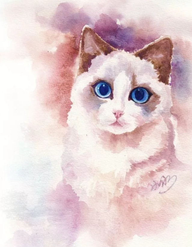 Рисунок акварелью. Котик с голубыми глазами