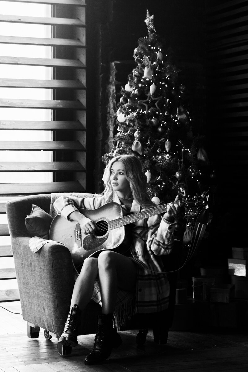 Для поднятия новогоднего настроения маленькая фотосессия. Очень не хотелось стандартного позирование в обнимку с ёлкой и игрушками, так что здесь она выступает просто неким симпатичным объектом на заднем плане. Модель умела играть на гитаре и прям предположила историю вроде Нины из "... с лёгким паром!" Хотя на деле общего ничего нет, ну, кроме музыкального инструмента и цвета волос главной героини и модели. А временами настроение было больше похожее на кота Матроскина. Работы сделал в чёрно-белой гамме из-за "безумного" цвета гитары, как мне показалось слишком яркой для общего антуража. Да и отсутствие цвета придает какую-то свою интересную историю. А вот светящиеся объекты в фото всегда камень преткновения. Я считаю, что если есть огонь свечи, фонарика или гирлянды, то они должны светиться и давать отражение на другие объекты. Но если снимать "как обычно", то они вроде как и светятся, но этого не видно. Здесь на чёрно-белом кадре огни гирлянды пропали, а на цветной фотографии они в