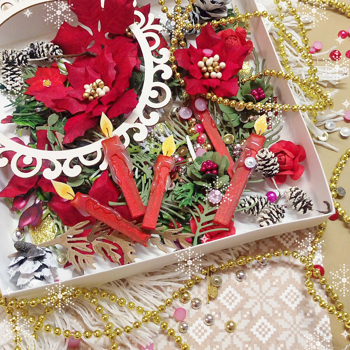 Праздничные свечи и пуансеттия превратились в яркую новогоднюю открытку