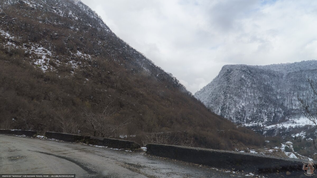 Путь из Ткварчели до места занимает меньше получаса. Немного даже с учётом лёгкой распутицы и остановками чтобы проникнуться величием гор, скребущих макушками не предвещающие ничего хорошего облака.