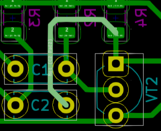 В данном случае, дорожка начинается на контактной площадке C2 и заканчивается на контактной площадке R4. Не смотря на то, что она, с привычной точки зрения, продолжается до контактной площадки VT2 и далее. С точки зрения KiCad это разные дорожки.