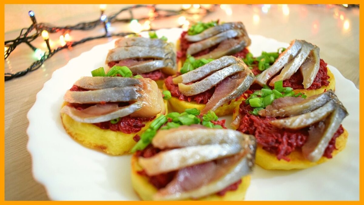 Готовимся к Новому году! Репетируем закуски к праздничному столу! Подписывайтесь на канал, дальше будет больше новых рецептов! Для приготовления бутербродов нам потребуется: -картофель -свекла отварная -зеленый лук -слабосоленая сельдь -чеснок -майонез или сметана по вкусу 1. Отварную свеклу натереть на мелкой терке, добавить чеснок и майонез, немного посолить. Перемешать. 2. Картофель нарезать на ломтики шириной 1,5-2 см., разложить на противень, смазанный растительным маслом, сверху смазать также растительным маслом, присолить. Поставить в духовой шкаф, разогретый до 200 градусов на 15-20 минут. 3. Сельдь очистить, нарезать на небольшие кусочки. 4. Готовый картофель остудить, разложить на тарелку, сверху уложить свекольную начинку, присыпать зеленым луком, и украсить сельдью. Приятного аппетита!