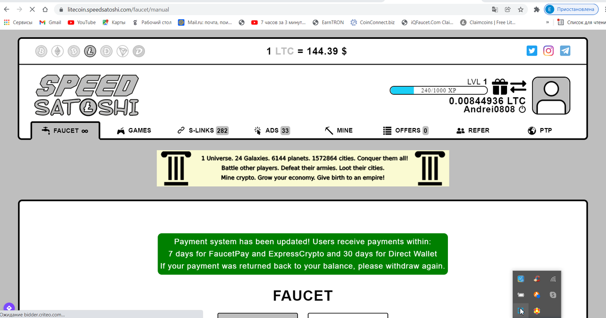 На просторах интернета нашёл просто суперский сайт по заработку криптомонет с выводом на FaucetPay. или на Ehexpresscrypto