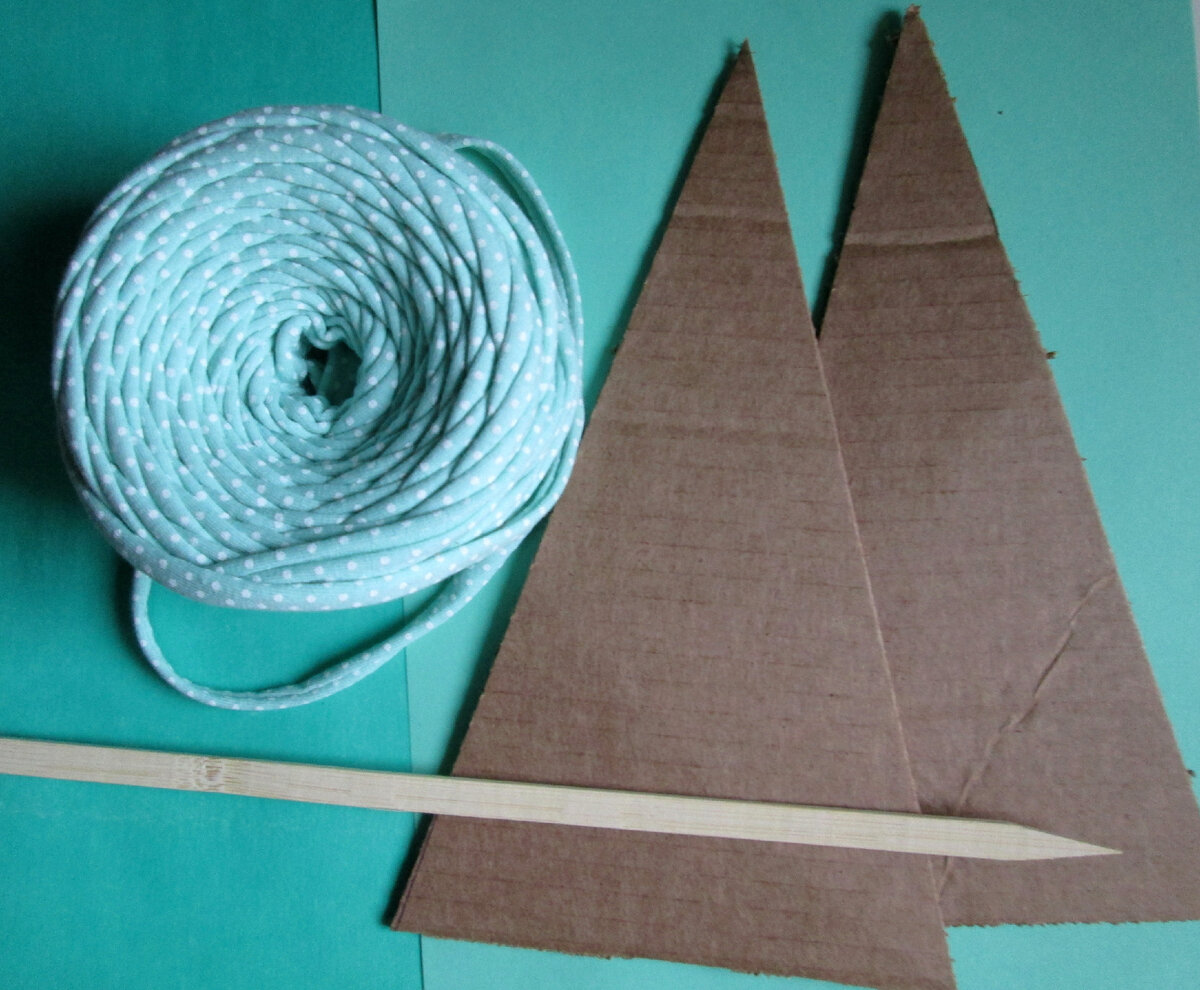 Перебирая остатки трикотажной пряжи, наткнулась на клубочки замечательных зимних цветов и решила сделать елочку. Елки, обкрученные пряжей, мне делать уже доводилось -хоть объемные, хоть плоские. Так что, вперед! Подобрала картон нужной толщины, в запасах оказались и палочки "стволы". Делаем выкройку из бумаги, обводим на картоне и вырезаем макетным ножом 2 заготовки. У настоящей елочки должен быть ствол-вклеиваем палочку между слоями картона. Чтобы работа смотрелась аккуратнее, лучше обклеить склеянный вдвое картон бумагой в цвет пряжи. Обклеиваем с одной стороны, оставив запас бумаги. Края подворачиваем и подклеиваем на другую сторону. Затем намазываем клеем необработанную сторону, прикладываем бумагу и обрезаем лишнее. Настало время взять в руки пряжу и клеевой пистолет. Начинаем с широкой части елки. Виток за витком, и вот наша елочка уже преображается. Настало время подставки под ель. У меня завалялась ненужная втулка. Можно было отпилить кусок от картонной втулки из-под бумажного