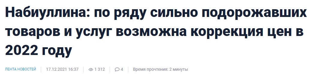 В заявлении по итогам заседания Банка России 17 декабря глава ЦБ Эльвира Набиуллина отметила, что по ряду сильно подорожавших в текущем году товаров и услуг в следующем году возможна коррекция цены. Анализ ситуации с инфляцией приводится в комментариях к решению о повышении ключевой ставки (напомню, что она была повышена на 100 базисных пунктов до 8,5%), а также в ЦБ не исключили дальнейшего неединоразового ее повышения в 2022 году. В пресс-релизе мысль сформулирована так, что ее вряд ли поймет простой обыватель: "баланс рисков", "проинфляционные и дезинфляционные факторы", "подстройка предложения к текущему спросу", "восстановление логистических цепочек" и т.д. Если перевести это все на доступный язык, получится, что ЦБ в 2022 году ждет некоторой коррекции (то есть, снижения) цен на товары и услуги, которые сильно подорожали в 2021 году. В первую очередь, речь идет о биржевых и экспортных товарах. Как это часто происходит на биржах, цена сначала разгоняется, потом достигает какого-то
