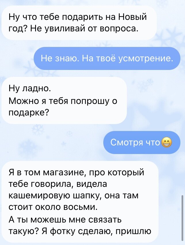 Всем привет! Буквально на днях моя коллега из другого отдела, с которой мы иногда пересекаемся в спортивном клубе пишет по поводу того, что же мне подарить на Новый год. Ранее такого не было. Мы с ней обменивались чисто символичными подарками друг с другом. А в этот раз она обратилась ко мне с вопросом, что мне подарить на Новый год. Я даже растерялась от этого. И, конечно, написала, что не знаю. Поскольку мы не в таких с ней отношениях, чтобы я могла сказать что мне подарить. Я еще было подумала, чего это вдруг она ко мне с таким вопросом обратилась. Но потом все стало ясно. Вот, собственно, сама переписка. Я не ожидала такого поворота. Вообще-то, я не вяжу в подарок. Только на заказ и то иногда, если мне это интересно. Я перечитала ее последнее сообщение несколько раз, а то вдруг я что-то не так поняла. Но нет. Человек просил меня связать ей в подарок шапку. Я ответила очень деликатно, что у меня на это не будет времени, хотя хотелось сказать немного по-другому. Да и мне, собствен