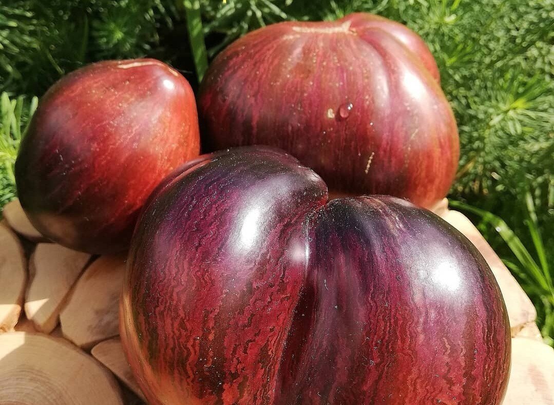 Среднеспелый, индетерминантный, 1,7м. Плоды по форме на одном кусте бывают разные, сердцевидные с носиком и даже плоскоокруглые. Он великолепен! На тёмно-вишнёвом фоне волнистые полосы разных оттенков-бордовые, фиолетовые, оливковые. Количество антоциана на плечиках будет зависеть от условий, которые вы им предоставите. Масса 200-300 грамм. Вкус гармонично сбалансированный, кислота и сладость присутствуют. Вести в 2 стебля.