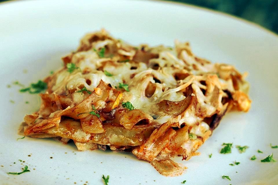 Готовить ее, впрочем, можно из любого вида пасты (макарон), просто тальятелле наиболее привлекательно в ней выглядят. Если говорить о вкусе… Похоже, эта запеканка родственница лазаньи (очень отдаленная), но бешамель для запекания тут не используются — в ход идут чистые сливки (чем жирнее, тем лучше). Мне не очень нравится идея запекания со сливками, обычно предпочитаю блюда, в которые добавлять сливки надо в самом конце приготовления, и лишь немного прогревать. Но тут они во время запекания звучат уместно — «цементируя» всю запеканочную массу. Единственное, сливки лучше брать пожирнее. Итак, понадобится: Как готовим: Макароны отвариваем, лучше — до полуготовности. Лук нарезать мелкими кубиками, обжарить немного и добавить к нему фарш. Фот фарш уже жарим до рассыпчатого состояния и золотистости. Как только оно достигнуто, вливаем вино, добавляем томатную пасту, тимьян и орегано, перец, соль и тушим минут пять. Отваренные макароны добавляем прямо в фарш, перемешиваем. Потом выкла