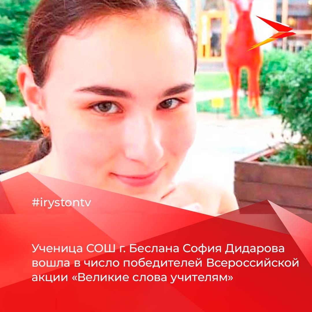 Ученица средней общеобразовательной школы г. Беслана София Дидарова вошла в число победителей Всероссийской акции «Великие слова учителям». Всего в акции приняло участие свыше двух тысяч человек со всей России. Школьники публиковали в социальных сетях «ВКонтакте», «Инстаграм» и «ТикТок» видеоролики и картинки, которые раскрывали великие слова известных людей об их учителях. Кто-то с помощью рисунка проиллюстрировал мудрость высказывания, а кто-то процитировал понравившиеся мысли, записав это на видео. Под хештегом #ВеликиеСловаУчителям в социальных сетях «ВКонтакте», «Инстаграм» и «ТикТок» появились сотни постов и видео. Победителями признаны авторы 30 работ, которые получат памятные призы. Организаторы – Минпросвещения России, Группа компаний «Просвещение», Фонд новых форм развития образования. Пресс-служба Минобрнауки РСО-Алания