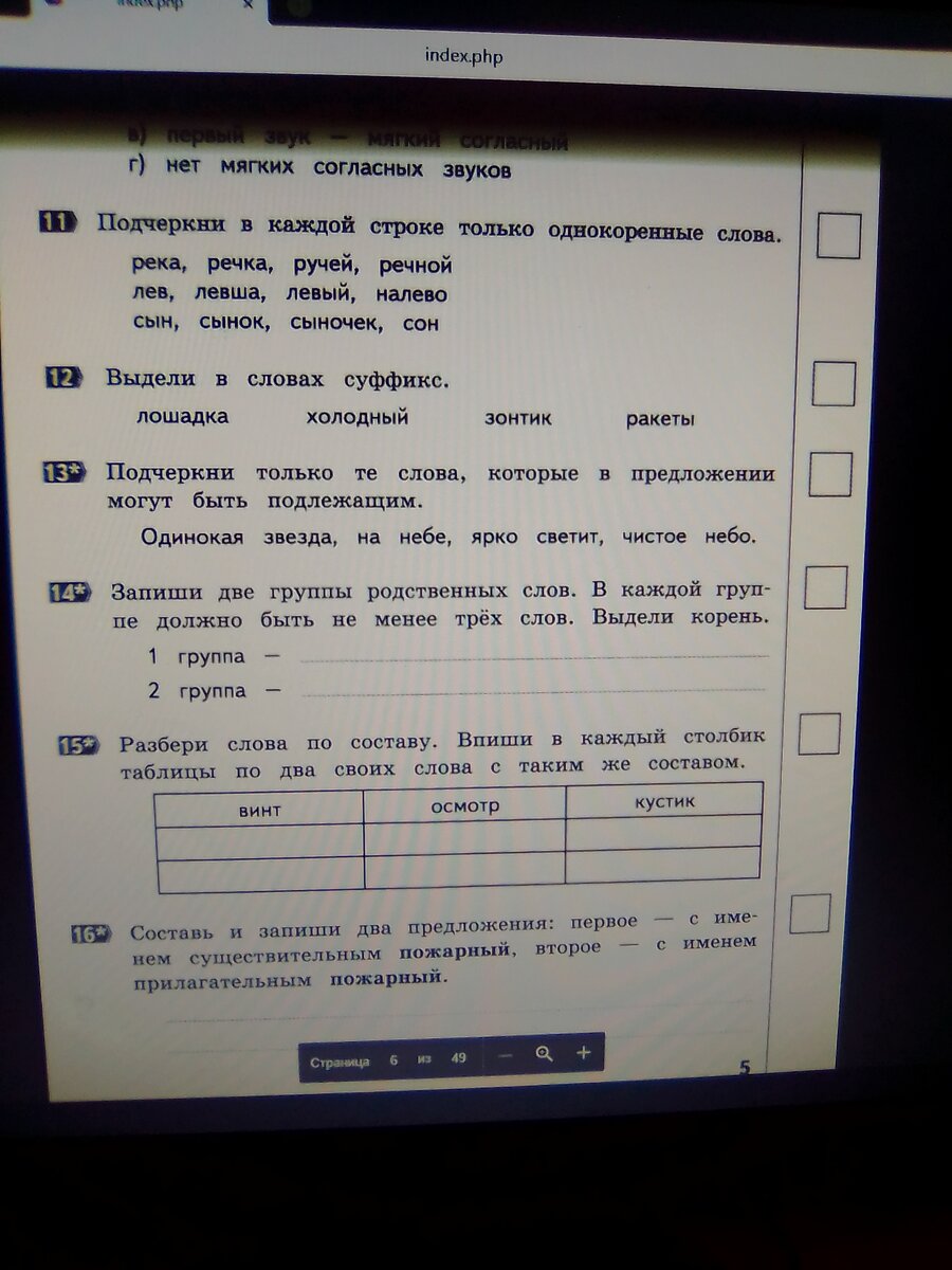 Ну, наиболее трудные задания здесь помечены звёздочкой. Давайте с ними и попробуем разобраться. В задании 13 ищем слова, которые могут быть подлежащими. Напоминаю: подлежащие-это существительные, стоящие только в начальной форме, т.е. в именительном падеже, и именно они выполняют действие. Но у нас нет существительных с глаголами, а есть существительные с прилагательные. Тогда пытаемся с ними придумать предложение. Например: На небе светит одинокая звезда. Здесь "звезда" главная, она "светит". Значит, это слово будет подлежащим. Разбираемся со вторым словосочетанием-" чистое небо" Что можно придумать с этим словосочетанием? Ну, к примеру Весь день было чистое небо. "Небо" -главное. Что делало? "Было." Значит, слово "небо" является подлежащим. Смотрим задание 14. Требуется две группы родственных слов Родственные слова имеют общий корень и общий смысл Вода, водичка, водяной, водный Бег, беговая, бегать, разбег В задании 15 требуется придумать два предложения со словом "пожарный".
