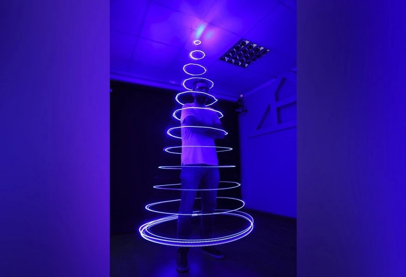 Один конец светодиодной ленты мы прикрепили к потолку, на другой конец подвесили груз. Когда фотограф крутанул светодиодную ленту вокруг себя, то запечатлел следы и параллельные круги, оставленные светом в воздухе.