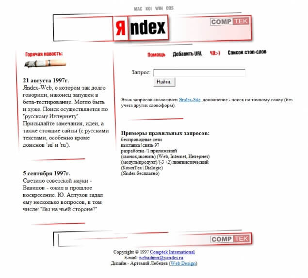 Поисковая система Yandex (1997 год)