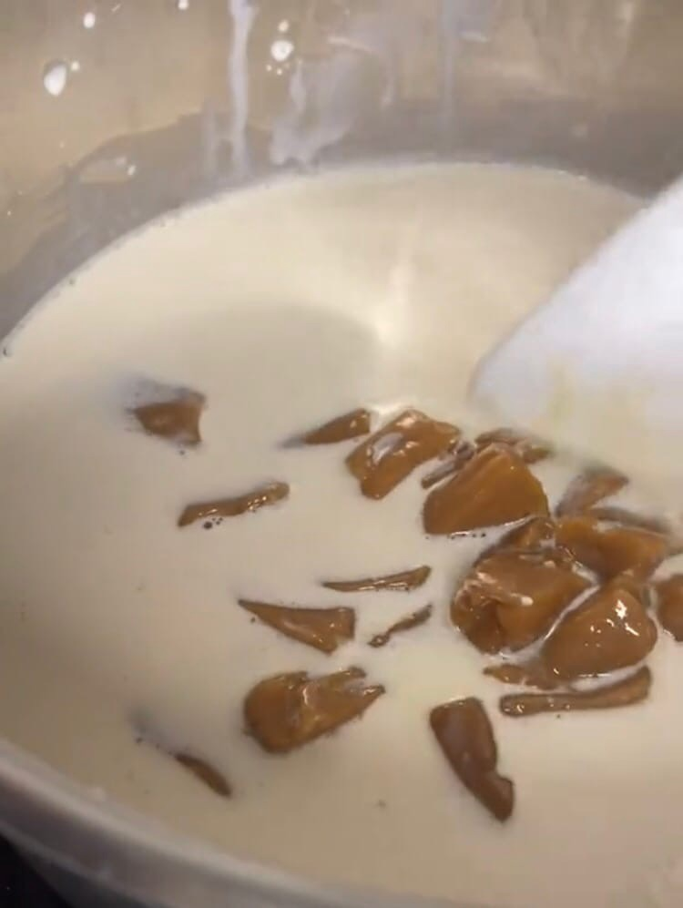 Подойдет как "Золотой Ключик" так и "Кис-Кис". Выкладываем ириски в кастрюлю с толстым дном, заливаем сливками 33% -примерно 100 мл. Затем растапливаем эту массу на СРЕДНЕМ огне, постоянно помешивая.