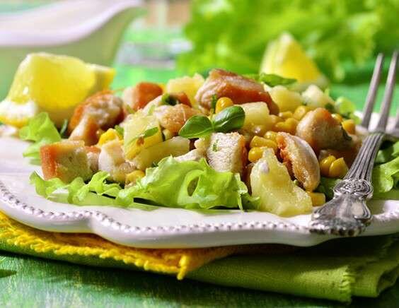 - Куриное филе отварить. Все ингредиенты мелко нарезать и перемешать. Заправить салат майонезом, сбрызнуть лимонным соком. При желании салат можно украсить оливками и зеленью.