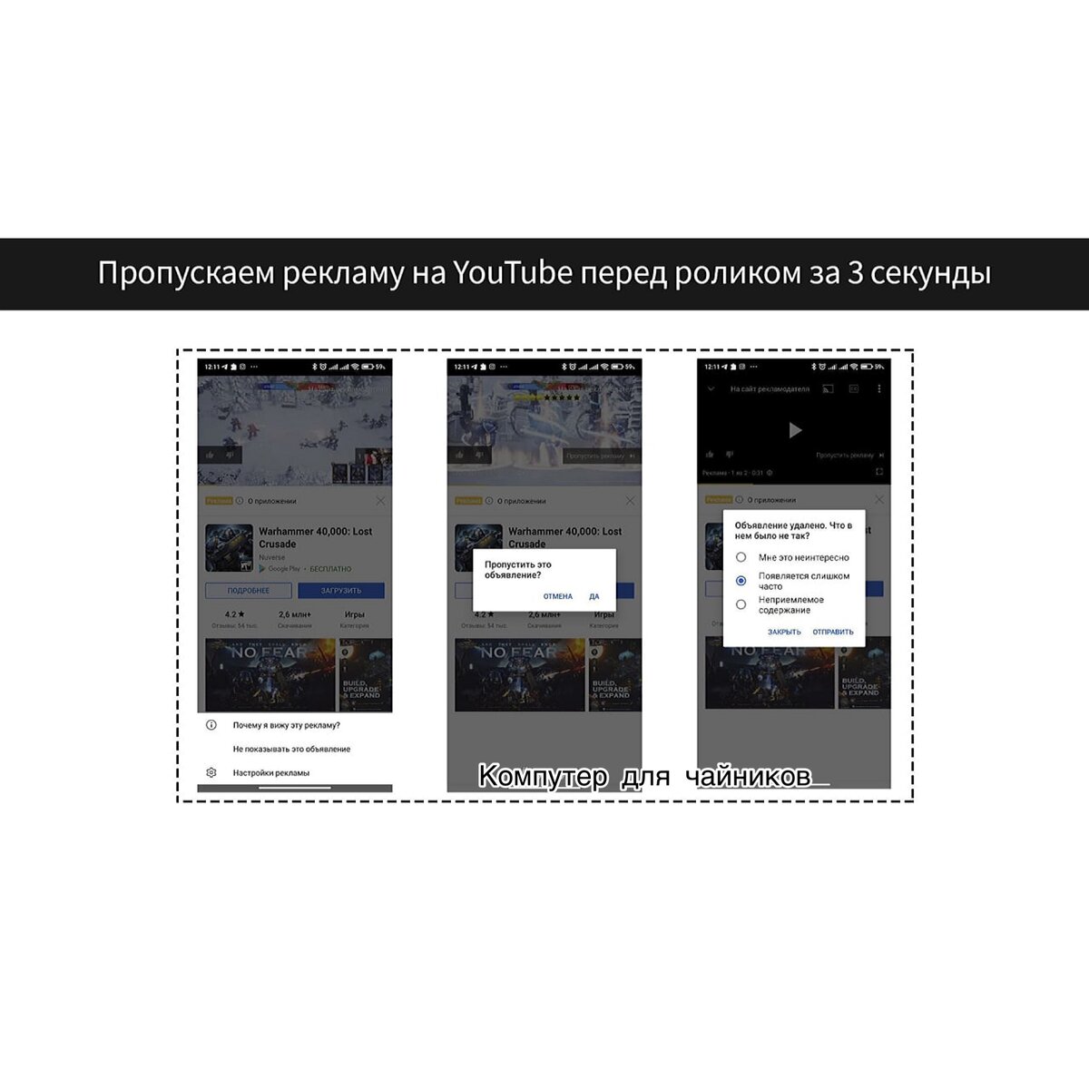 Для тех кто ненавидит рекламу перед роликом, которую нужно смотреть полностью или ждать кнопку "Пропустить". Можно воспользоваться лайфхаком и пропускать рекламу не дожидаясь кнопку. Чтобы пропустить рекламу нужно: 1) Когда появиться реклама, нажать желтую плашку "Реклама" 2) Нажать "Не показывать это объявление", затем "Да" 3) Выбрать "Появляется слишком часто"